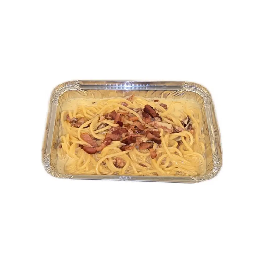 Zubereitet mit Speck, Ei, Rahmsauce und Parmesan