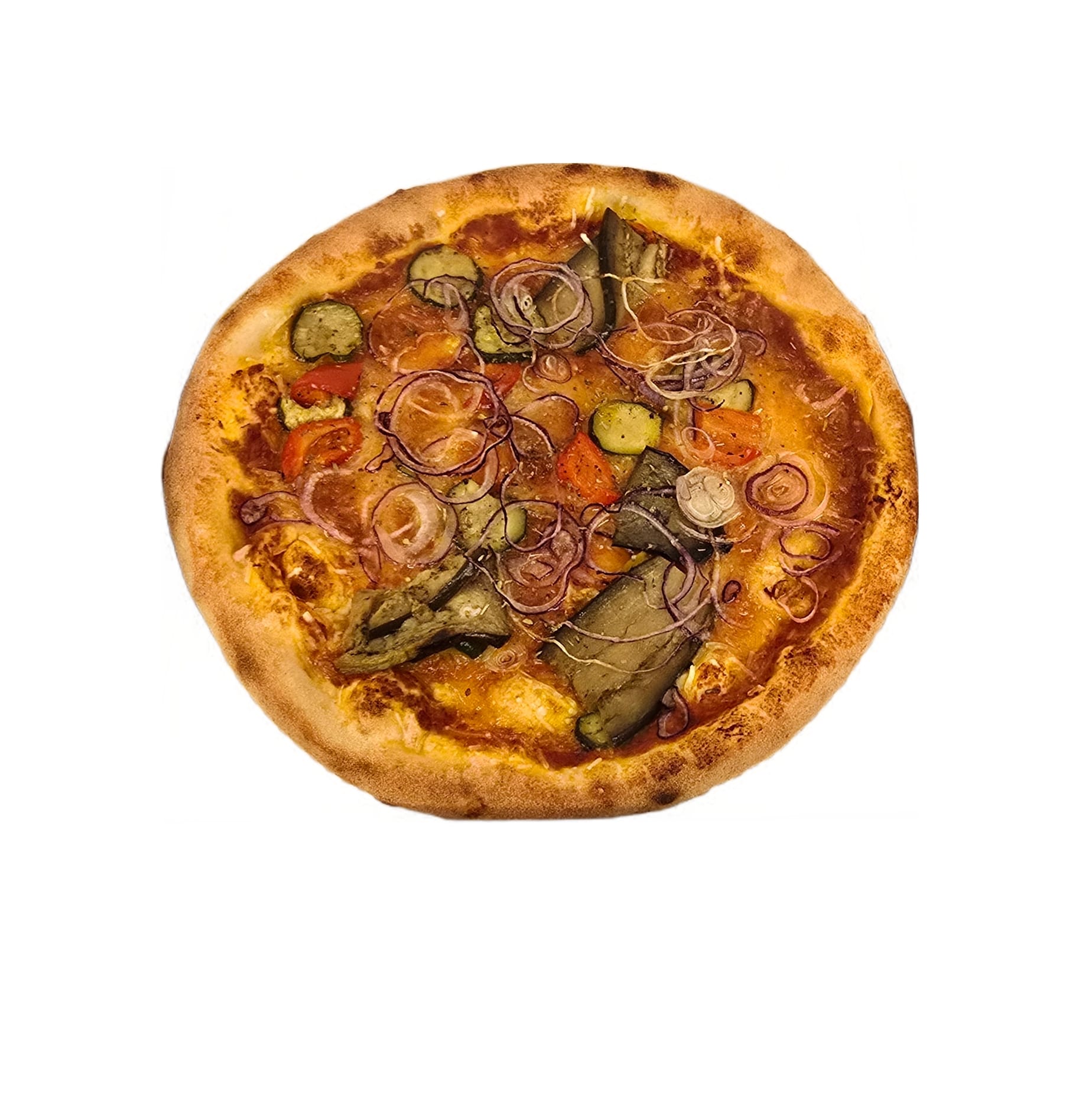Tomatensauce, veganer Mozzarella, Peperoni, Aubergine, Zwiebeln, Knoblauch, Zucchetti, Oregano